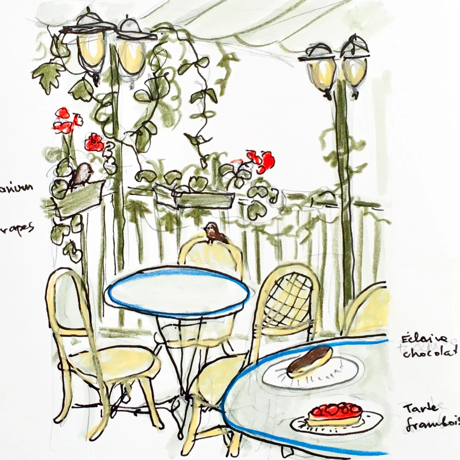 I found this to be somewhat true. I rarely complete significant pieces of writing in coffee shops. Part of the reason is, I am rarely comfortable enough to complete a long chunk of work. But small work-sessions happen quite readily against the distraction of a coffee shop. Quick (about one hour) sessions are great for making plans, lists, sketches, and outlines. They’re great for reviewing and consolidating old ideas, and finding the ones worth acting upon. And finally, the short chunks of time are good for a rough but honest illustration from real life. For example, the drawing above is - wait for it - my sketch from a cafe in Montmartre, the very artistic hill in Paris.
