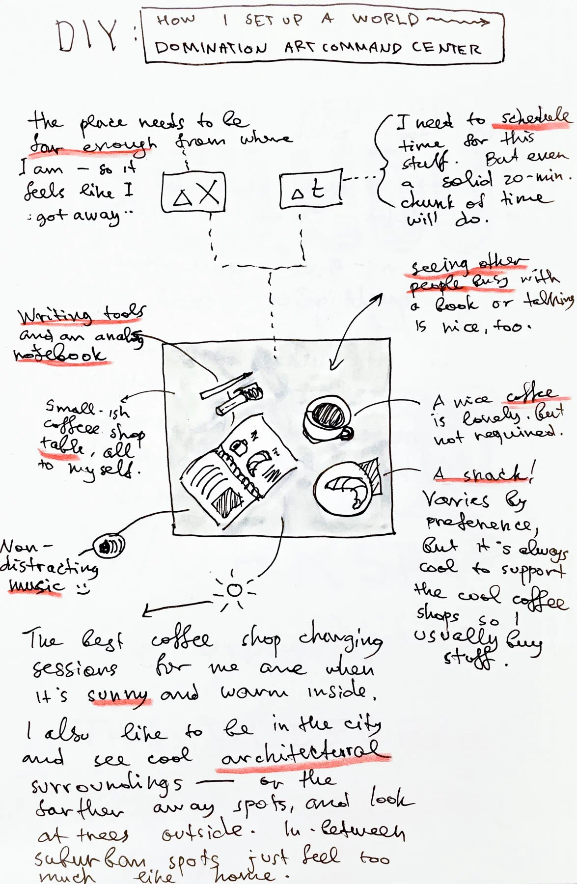 My favorite set-up feels like a world domination command center about halfway through the coffee cup, and every idea feels cool on the wave of this enthusiasm. I know that not all of them will be great or useful, but I separate the ideation from evaluation and keep them going.